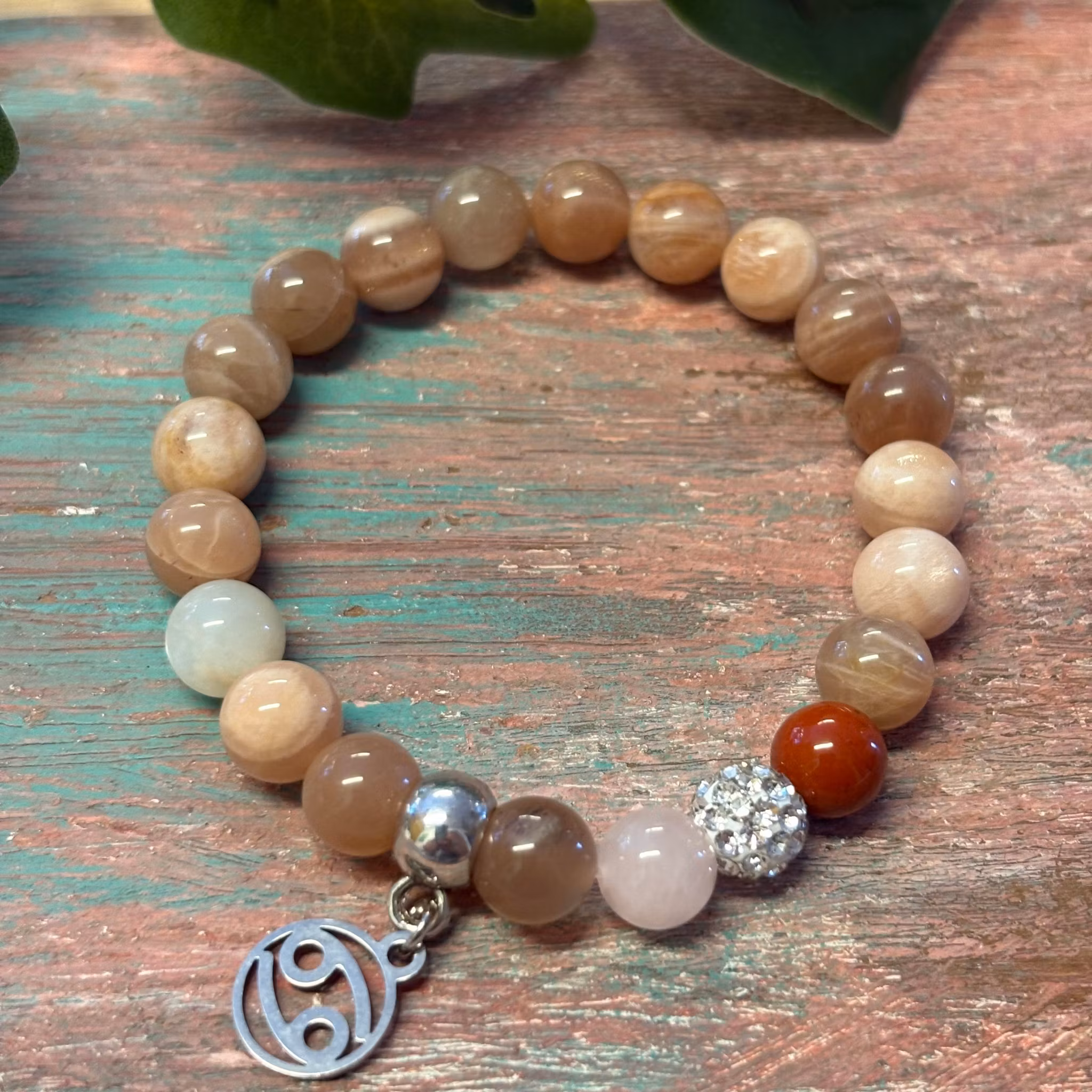 Ett skyddande och hjärtcentrerat armband med månsten, rosenkvarts och röd jaspis – kristaller som stödjer Kräftans känsliga, intuitiva och omhändertagande natur.
