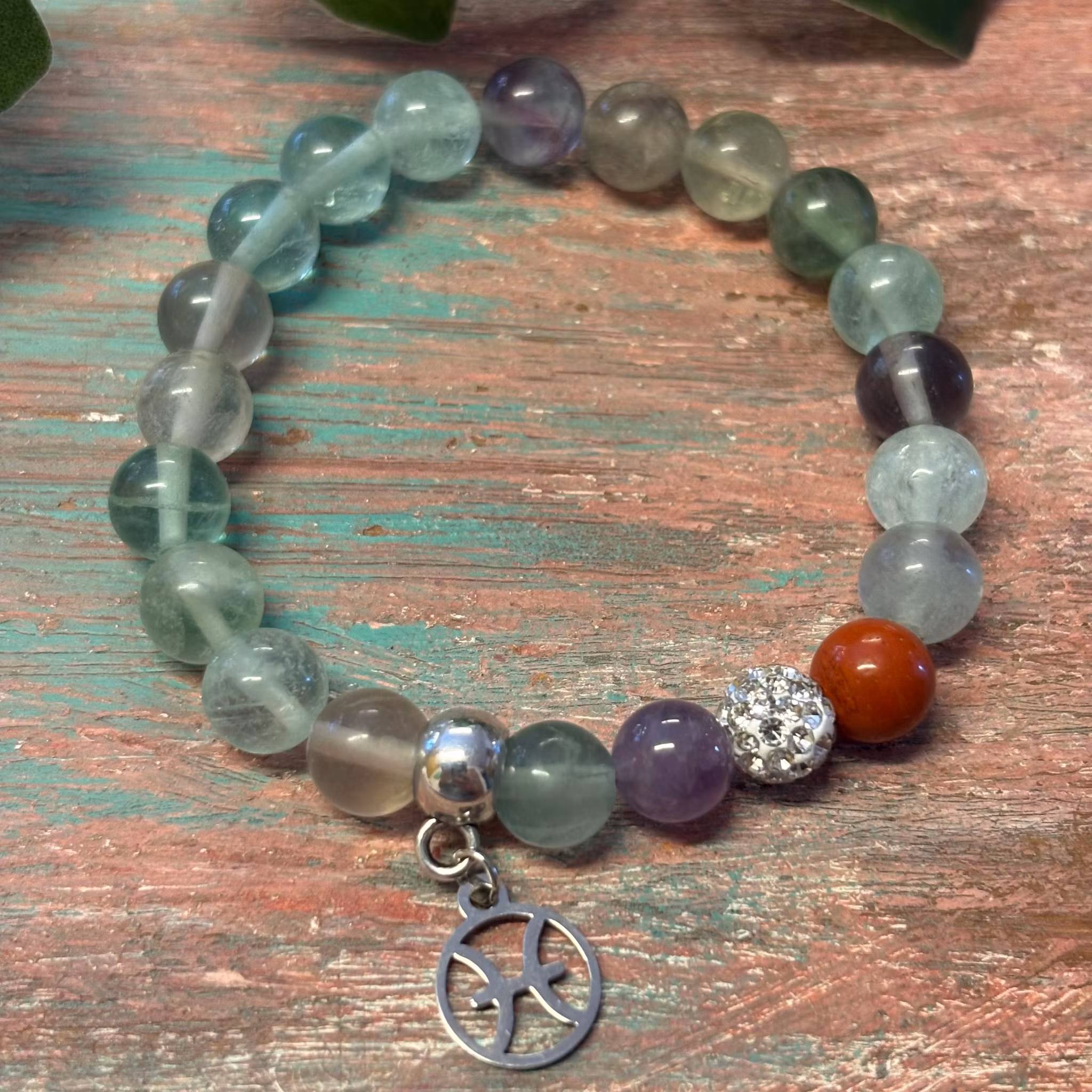 Ett drömskt och intuitivt armband med fluorit, ametist och röd jaspis – stenar som stödjer Fiskens känsliga, kreativa och andliga natur.