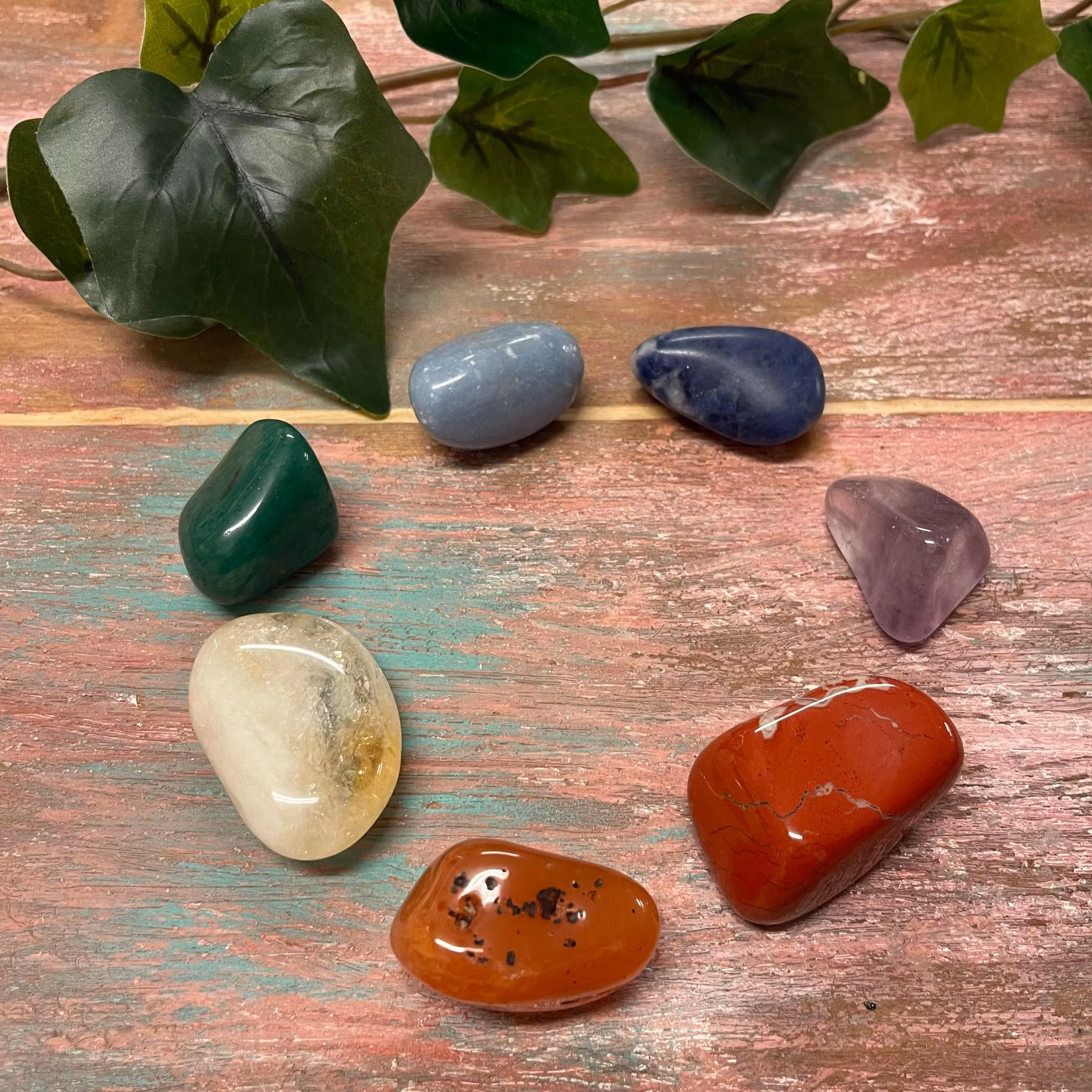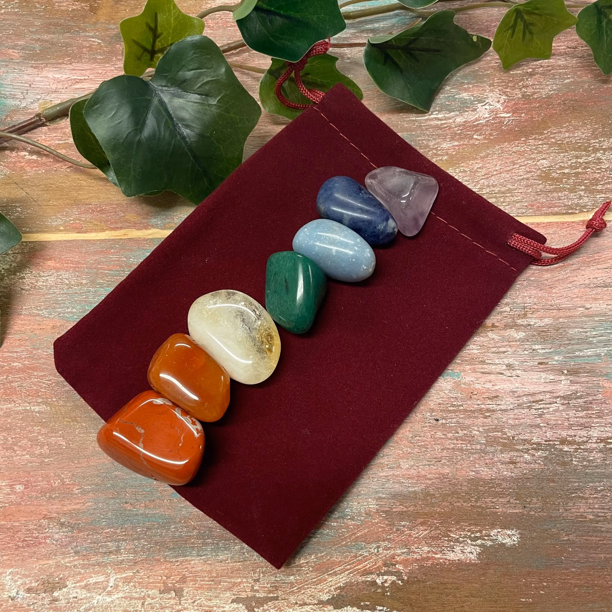 Sju st tumlade kristaller en för varje chakra , levereras i en tygpåse (påsens utseende kan variera) och beskrivning.