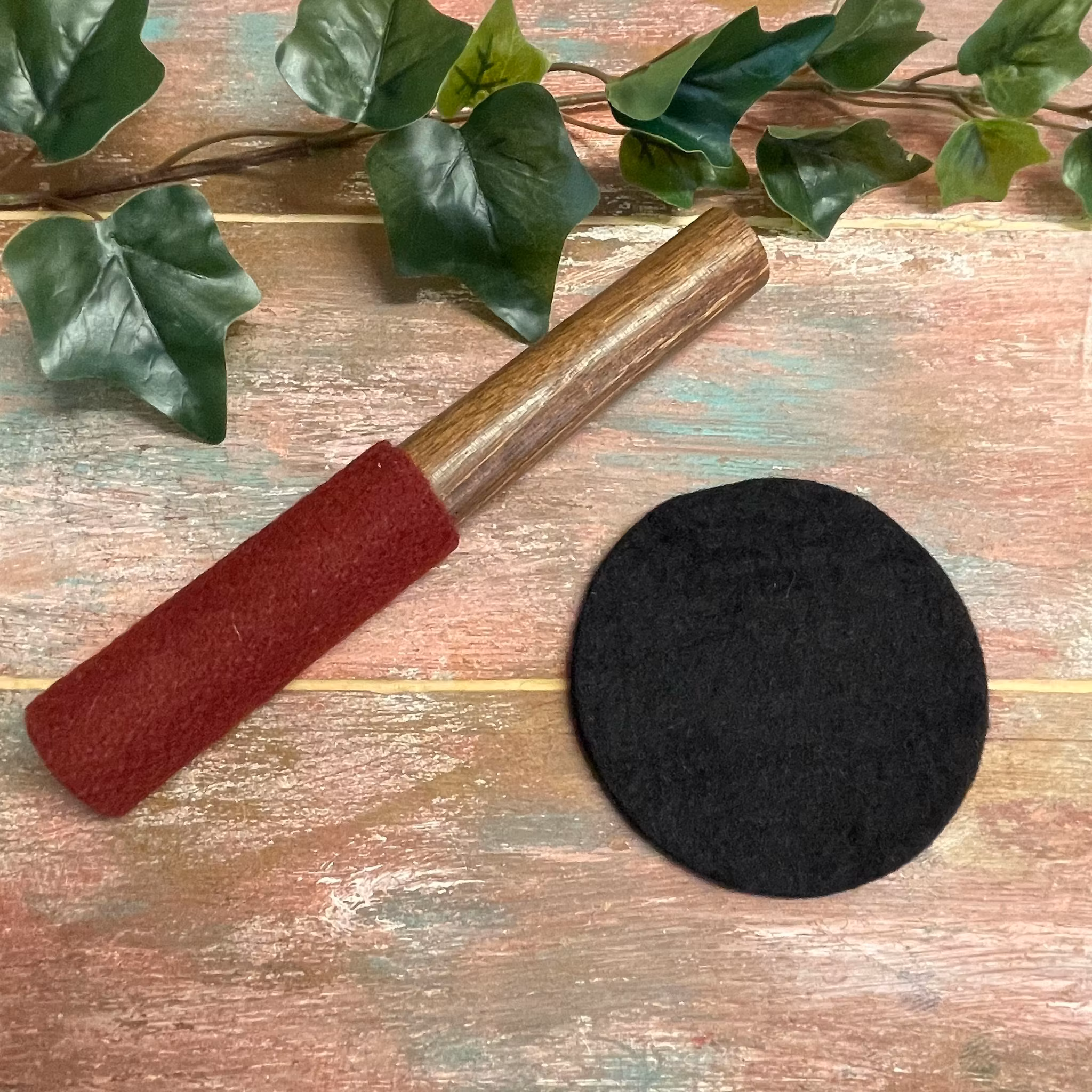 OBS ! Leverera med svart filt underlägg och en slagpinne i teak med ull ca 20 cm.