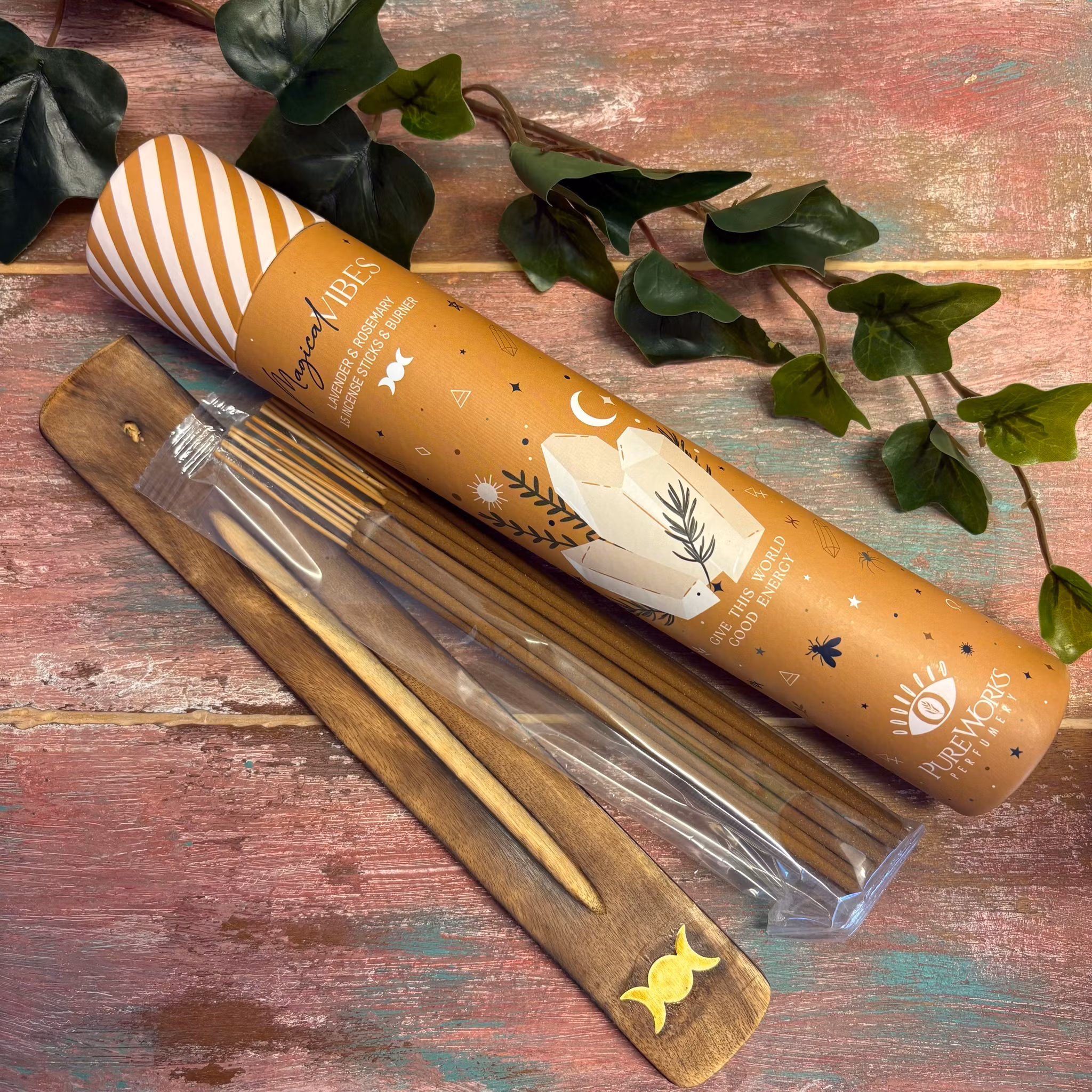 Rökelseförpackningen levereras tillsammans med en träbrännare i form av en trippelmåne och ett paket med 15 rökelsepinnar.