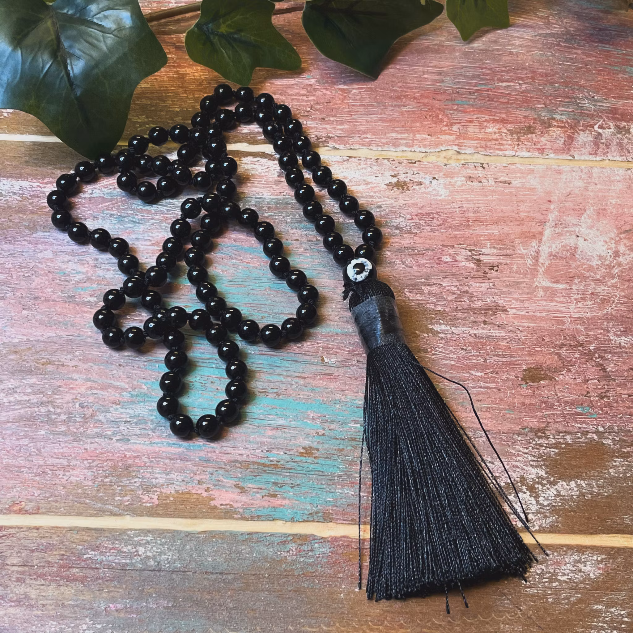 Mala med Svart agat och Dzi agat pärlor och en tofs. storlek 6