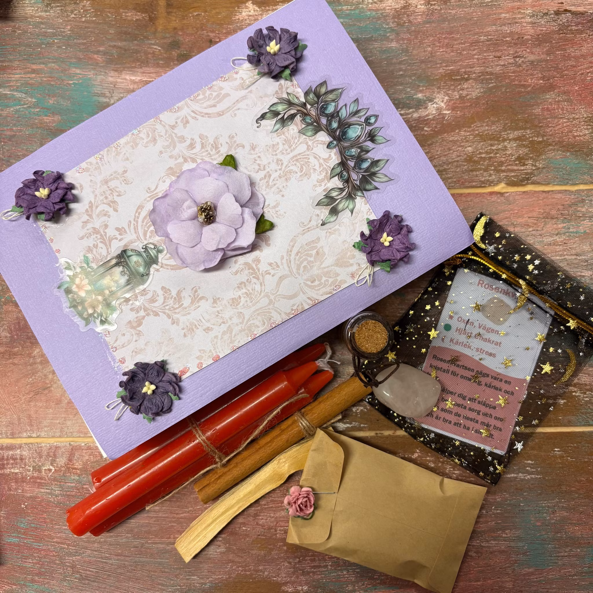 I denna box har du allt du behöver för att göra en ritual för Kärlek. På botten av lådan hittar du ritualen. Varje låda är unik ,då Marie har dekorerat alla lådor för hand.