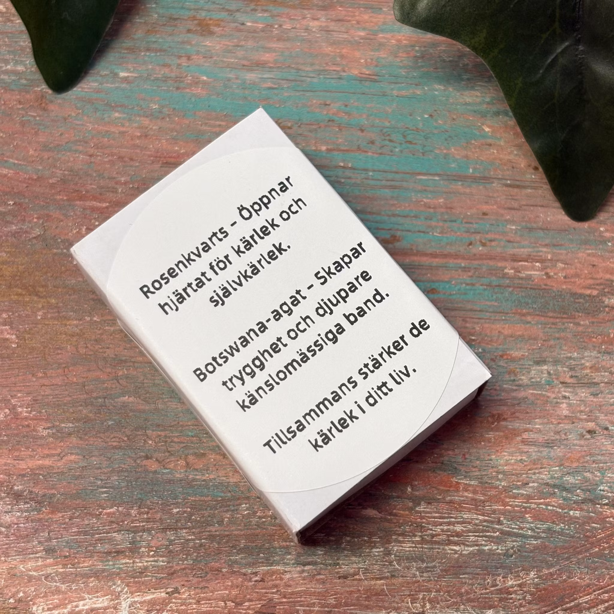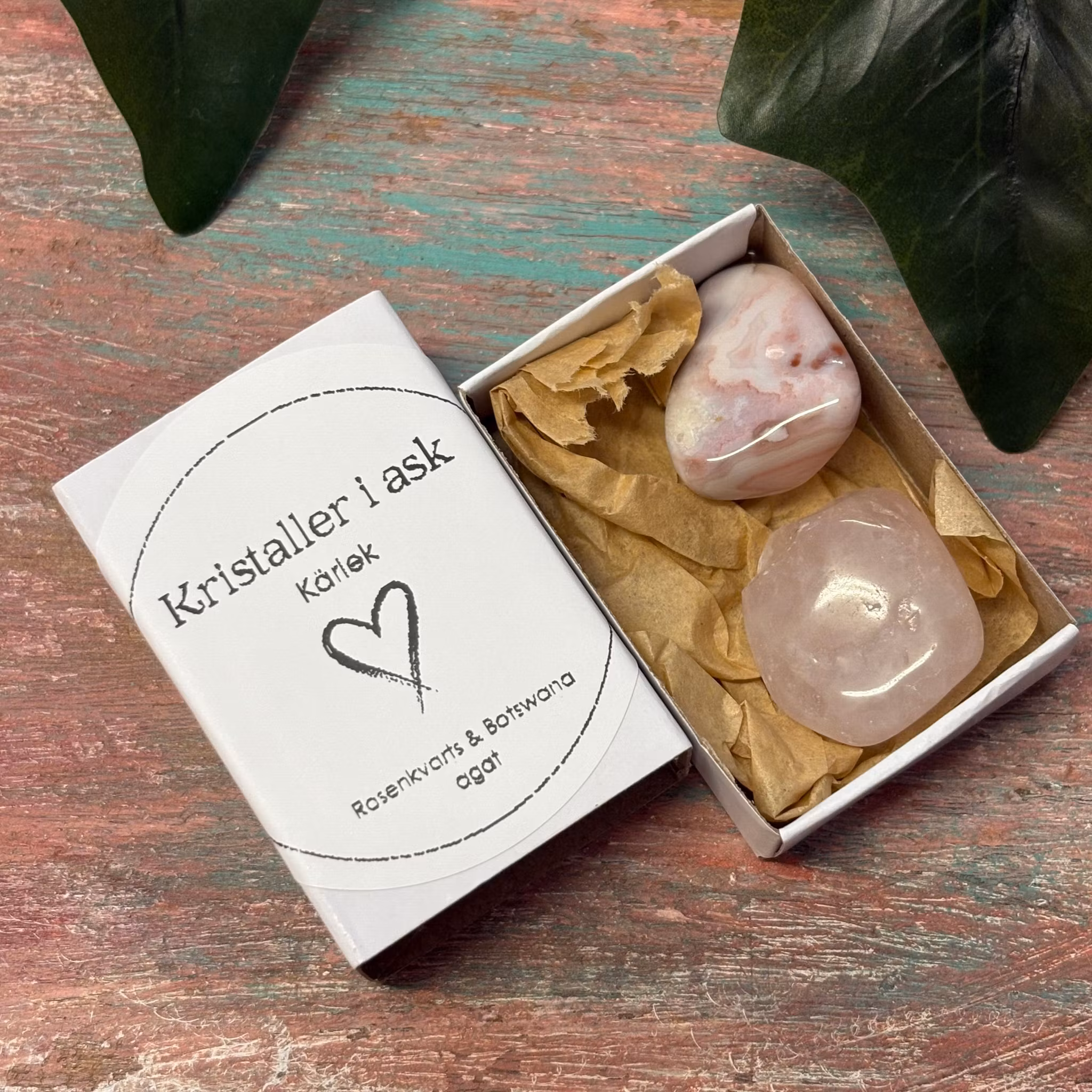 En liten ask med två kristaller för att dra till sig kärlek, på undersidan finns en förklaring hur du gör.