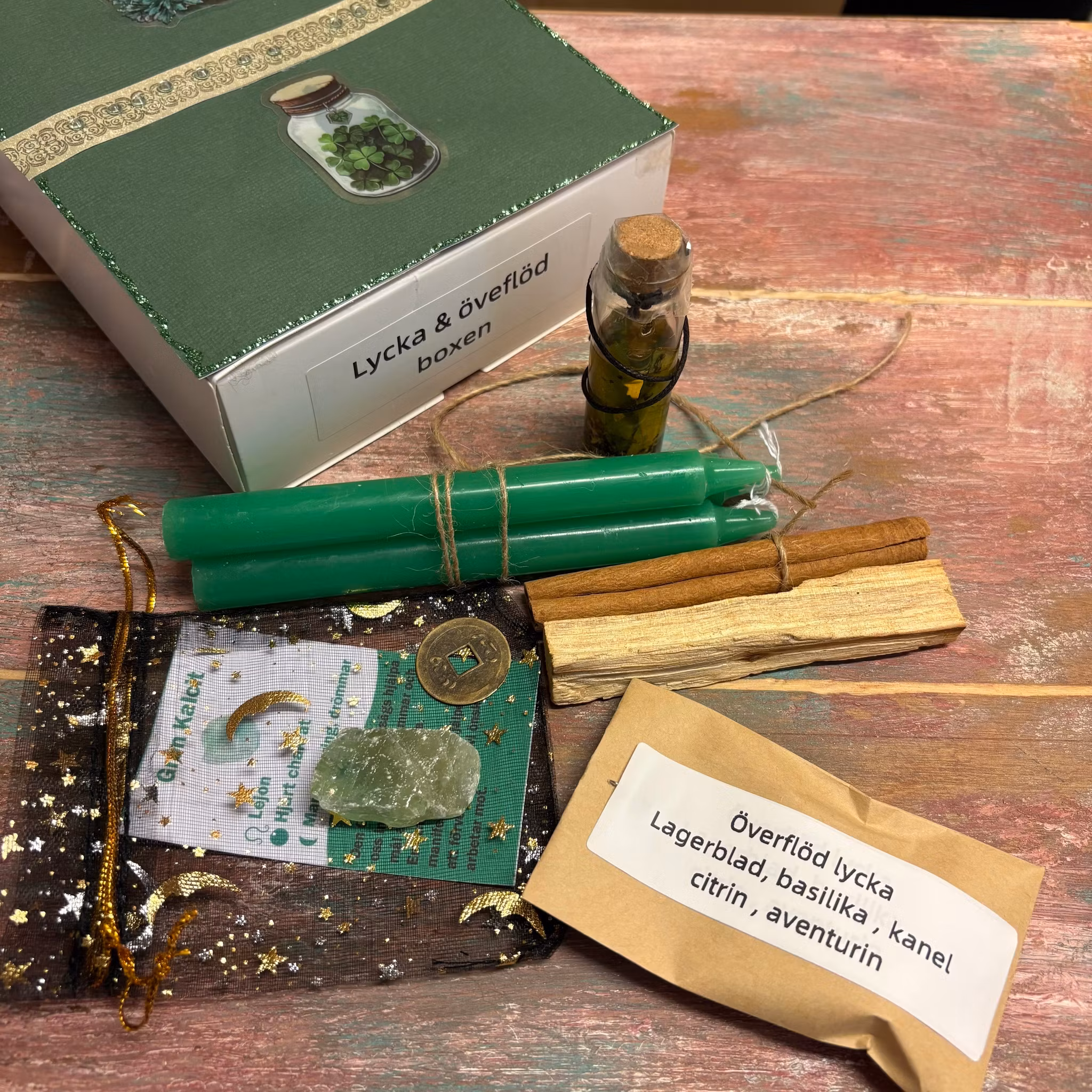 I denna box har du allt du behöver för att göra en ritual för överflöd, på botten av lådan hittar du ritualen. Varje låda är unik då Marie har dekorerat alla lådor för hand.